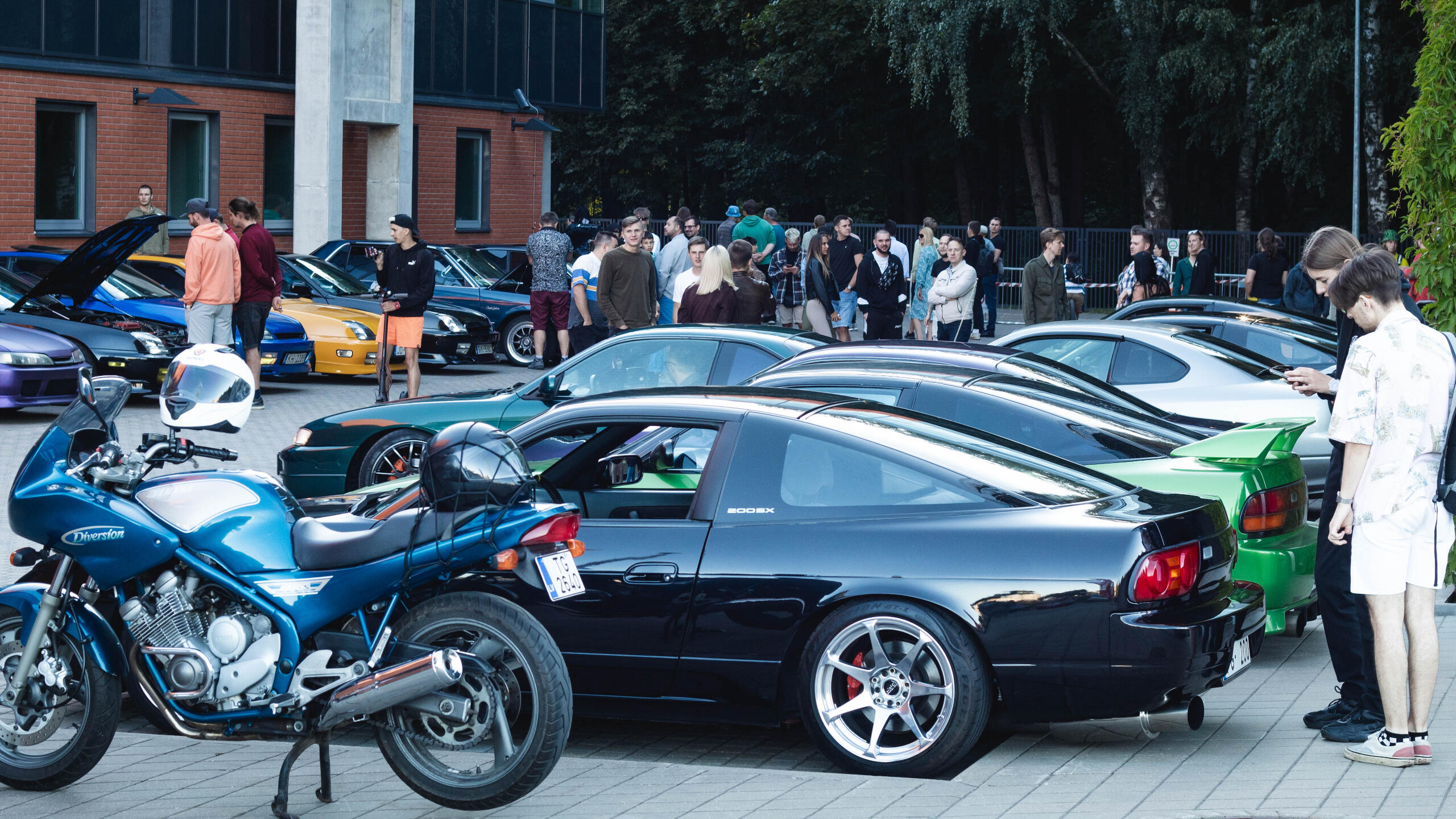 A large gathering of Japanese automotive enthusiasts next to Riga Car Museum organized by Youngtimerrally.lv